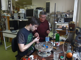 ![]() Подлив гелия в 100-литровый криостат со сверхпроводящим магнитом в новой лаборатории. |